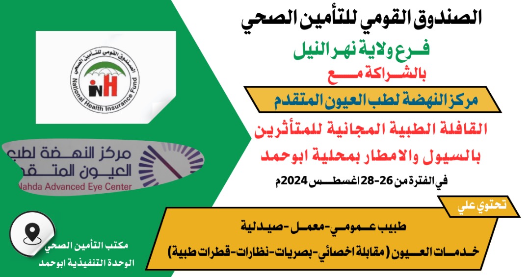 أعلن الصندوق القومي للتأمين الصحي فرع ولاية نهر النيل وبشراكة زكية مع مركز النهضة لطب العيون المتقدم عن قيام قافلة طبية مجانية للمتاثرين بالسيول والأمطار بمحلية ابوحمد