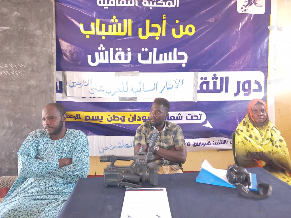 أقامت مؤسسة النسور التربوية قسم المكتبة الثقافية جلسة نقاش حول موضوع الآثار السالبة للحرب على النازحين حيث ادارها ويسرها الدكتور مصطفى عبدالله وذلك بمدرسة الجنوبية بنات بديم عرب كما استهدفت الجلسة عد. ٣٠ مستهدف من الشباب ومفاتيح المجتمع من عمد ونظار ومراة وقد تم مناقشة مواضيع الورقة باحترافية عالية وشهية مفتوحة ادت لتحقيق الأهداف المرجوة من الجلسة باستنباط توصيات فعالة ترقى لأهمية الجلسة كما تم تقديم عرض مسرحي ( مسرح على الهوى ) من مجموعة الرصيف المسرحية بقيادة الاستاذ محمود أبو طالب وتم الاعداد وتنفيذ الليلة الثقافية والتي شارك في تقديم فقراتها كلا من فرقة اومكر للتراث البجاوي ممثلة في فرقة الأمل قدم خلال الفقرة عرض غنائي نال استبيان الجميع وقبل هذه الفقرة قدم مشر ظار الإيواء بحي ديم عرب كلمة طاغية وكافية وقدم تهنئة للسيدات اللائي قذن في منافسة كرة الطائرة للسيدات بولاية البحر الأحمر وتقرر تكريمهن من خلال تلك الفعالية وتقديم عروض من مجموعة نفاج التومات وعالم الأطفال لو لا حدوث طارى أدى إلى إنهاء البرنامج املين من الله تتاح لمؤسسة النسور التربوية الفرصة لتنفيذ برامجها للمجتمع بصورة تحقق الأهداف المرجوة .
