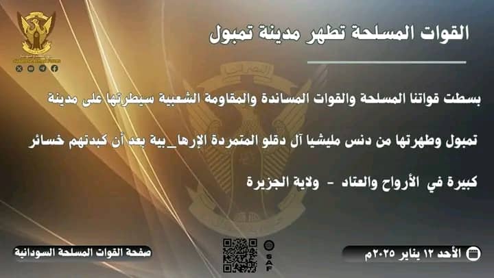 بسطت قواتنا المسلحة والقوات المساندة والمقاومة الشعبية سيطرتها على مدينة تمبول وطهرتها من دنس مليشيا آل دقلو المتمردة بعد أن كبدتهم خسائر كبيرة في الأرواح والعتاد – ولاية الجزيرة – ١٢ يناير ٢٠٢٥م.