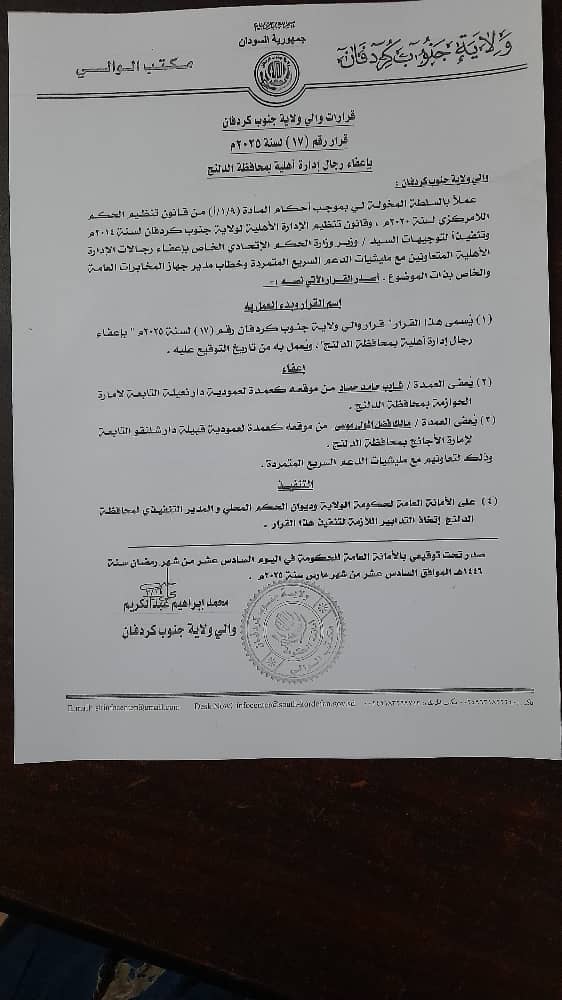 أصدر والي ولاية جنوب كردفان الأستاذ محمد إبراهيم عبد الكريم قرارين أعفى بموجبها عددا من رجالات الإدارة الأهلية بجنوب كردفان لتعاونهم مع مليشيات الدعم السريع