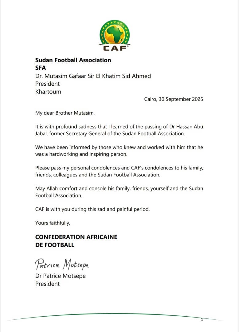 الخرطوم 1-10-2025 (سونا) – تلقى رئيس الاتحاد السوداني لكرة القدم الدكتور معتصم جعفر سر الختم رسالة من رئيس الاتحاد الأفريقي لكرة القدم (كاف) الدكتور باتريس موتسيبي معزيا في وفاة الدكتور حسن أبو جبل الأمين العام السابق للاتحاد السوداني لكرة القدم جاء فيها ما يلي :