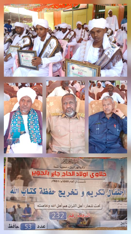 شهدت خلاوي اولاد الحاج جابر بالجوير (السبت) تخريج دفعة جديدة من حفظة القرآن الكريم لعدد (53) طالبا، بحضور وتشريف نائب والي ولاية نهر النيل وزير الثقافة والاعلام مصطفى محمد عثمان الشريف، والمدير التنفيذي لمحلية المتمة شمس الدين محجوب والدكتور اسامة حسن وكيل الشؤون الدينية والأوقاف ومدير شرطة محلية المتمة ومدير الجهاز والمخابرات العامة ومدير الشؤون الدينية وعدد من أعيان المنطقة.