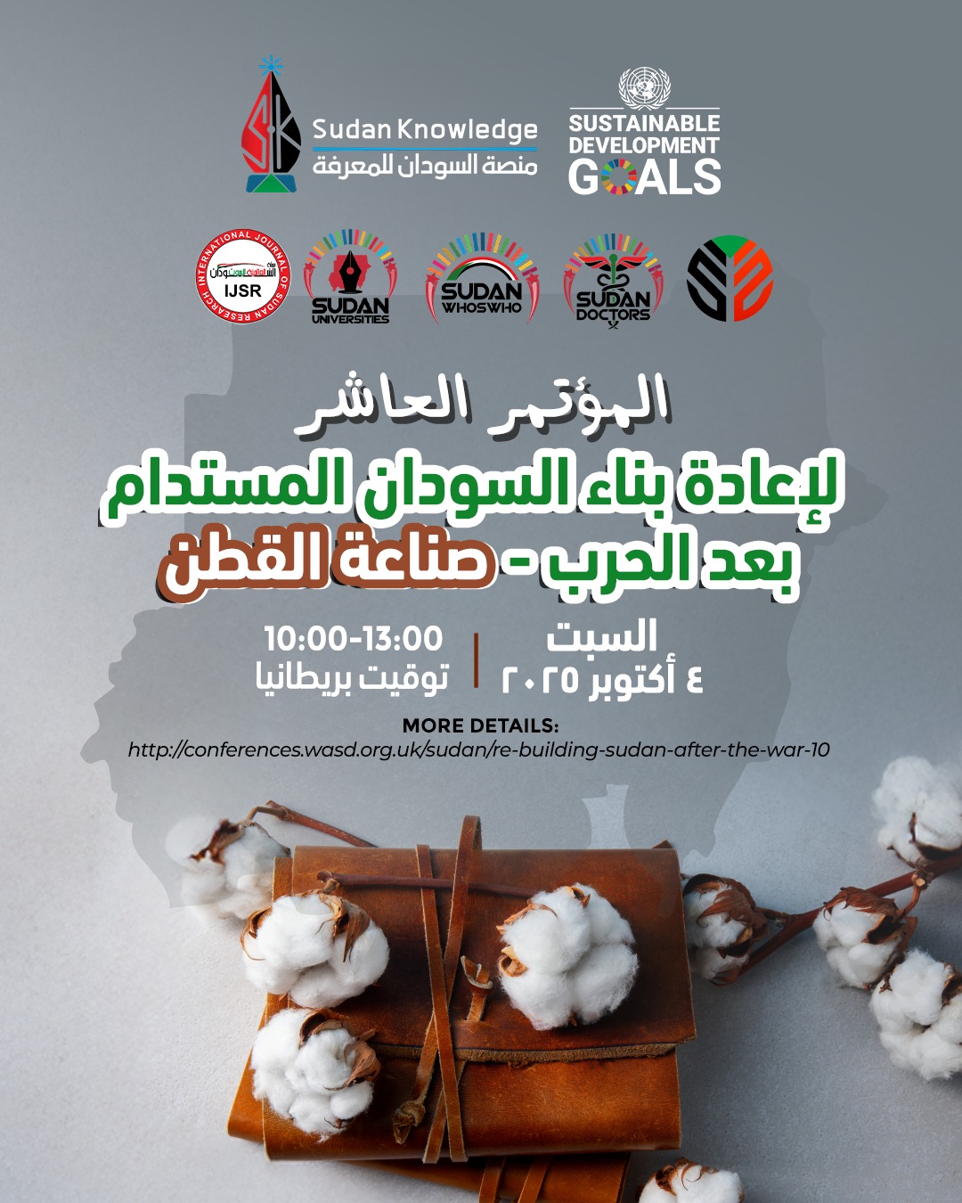 عُقد يوم السبت الموافق 4 أكتوبر 2025 بلندن المؤتمر الدولي العاشر لإعادة بناء السودان المستدام بعد الحرب، تحت عنوان _”صناعة القطن”_ ، بصيغة افتراضية عبر الإنترنت، online بتنظيم من *منصة السودان للمعرفة* وبإشراف علمي من *البروفيسور علام أحمد* ، مؤسس المنصة ورئيسها. تناول المؤتمر دور القطن في دعم التنمية المستدامة، وتعزيز سلاسل القيمة الزراعية والصناعية، بمشاركة نخبة من الباحثين السودانيين والدوليين.