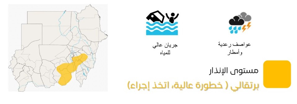 أصدرت الهيئة العامة للأرصاد الجوية اليوم إنذاراً باللون البرتقالي من خطورة عالية في كل من غرب القضارف، جنوب الجزيرة، شمال غرب سنار، جنوب النيل الابيض، جنوب شرق ولاية شمال كردفان و شمال وجنوب ولاية جنوب كردفان، حيث يُتوقع هطول أمطار غزيرة مصحوبة بعواصف رعدية، وقد أوضحت هيئة الأرصاد الجوية أن هذه الأمطار والعواصف الرعدية متوقعة اليوم الأربعاء8 أكتوبرالساعة الرابعة مساءً، وقدرت الهيئة أن هطول الأمطار قد يحدث في وقت ما بين عصر اليوم حتى وقت متأخر منه تقريباً بحدود الساعة الحادية عشرة من هذه الليلة.