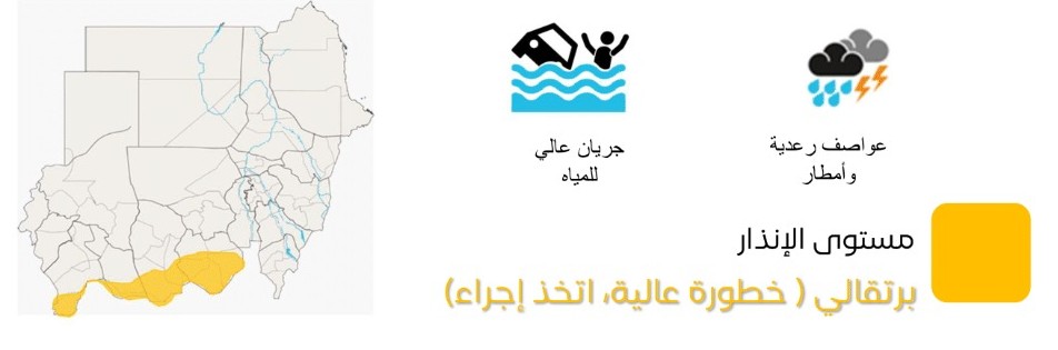 أصدرت الهيئة العامة للأرصاد الجوية اليوم إنذاراً باللون البرتقالي من خطورة عالية في كل من وسط وجنوب ولاية جنوب كردفان، جنوب ولاية غرب كردفان و جنوب ولايتي شرق و جنوب دارفور، حيث يُتوقع هطول أمطار غزيرة مصحوبة بعواصف رعدية قد تتسبب في جريان عالي للمياه في المناطق المنخفضة والأودية ، وقد أوضحت هيئة الأرصاد الجوية أن هذه الأمطار والعواصف الرعدية متوقعة اليوم السبت 11 أكتوبرالساعة الثالثة مساءً، وقدرت الهيئة أن هطول الأمطار قد يحدث في وقت ما بين عصر اليوم حتى وقت متأخر منه تقريباً بحدود الساعة الحادية عشرة من هذه الليلة.