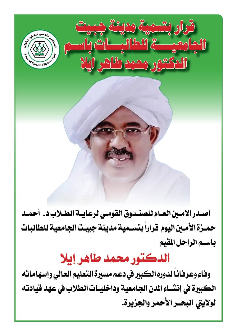 أصدر الامين العام للصندوق القومي لرعاية الطلاب د. احمد حمزة الامين اليوم قرارا بتسمية مدينة جبيت الجامعية للطالبات باسم الراحل المقيم الدكتور محمد طاهر ايلا وفاء وعرفانا لدوره الكبير في دعم مسيرة التعليم العالي واسهاماته الكبيرة في انشاء المدن الجامعية وداخليات الطلاب في عهد قيادته لولايتي البحر الاحمر والجزيرة.