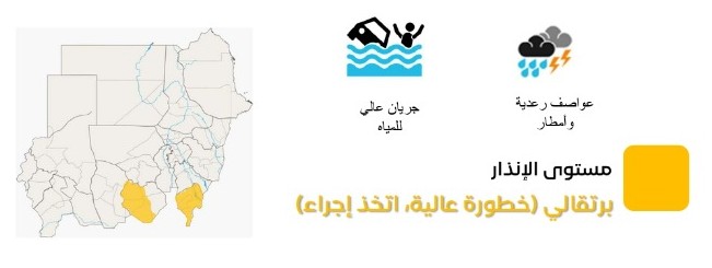 أصدرت الهيئة العامة للأرصاد الجوية اليوم إنذاراً باللون البرتقالي من خطورة عالية في كل من ولاية النيل الأزرق وغرب ولاية جنوب كردفان، حيث يُتوقع هطول أمطار غزيرة مصحوبة بعواصف رعدية قد تتسبب في جريان عالي للمياه في المناطق المنخفضة والأودية ، وقد أوضحت هيئة الأرصاد الجوية أن هذه الأمطار والعواصف الرعدية متوقعة اليوم الاثنين 13 أكتوبرالساعة الثالثة عصراً، وقدرت الهيئة أن هطول الأمطار قد يحدث في وقت ما بين عصر اليوم حتى وقت متأخر تقريباً بحدود الساعة الحادية عشرة و النصف من هذه الليلة.