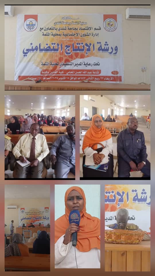 أقامت محلية المتمة وجامعة شندي قسم الاقتصاد بالتعاون مع إدارة الشؤون الاجتماعية بمحلية المتمة ورشة بعنوان (الانتاج التضامني) بقاعة عبدالله الحسن المحامي بكلية القانون، تحت رعاية المدير التنفيذى لمحلية المتمة بحضور ممثل المدير التنفيذى الاستاذ رابح احمد وعدد من مدراء الأجهزة الشرطية والامنية وممثلى المنظمات ومدراء الوحدات الإدارية وعمداء الكليات .