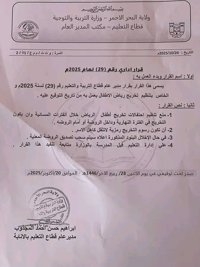 ولاية البحر الاحمر – وزارة التربية والتوجية قطاع التعليم – مكتب المدير العام قرار مهم من وزاره التربيه والتعليم بالبحر الأحمر