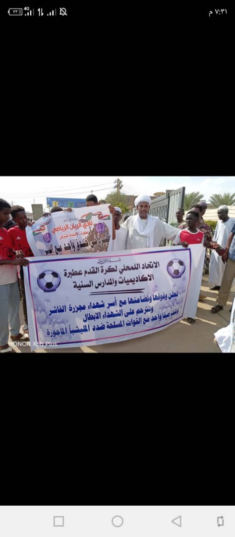 شهدت مدينة عطبرة عقب صلاة الجمعة مسيرة حاشدة بمشاركة واسعة للقطاع الرياضي والاندية الرياضية باتحاد عطبرة واندية الناشئين منددين بالمليشيات الارهابية معلنين مسانتدهم للقوات المسلحة وابدي ممثلي الاندية الرياضية استعدادهم لاعلان التعبئة العامة وسط الاندية وفتح المعسكرات لتدريب الشباب من اجل الدفاع عن حياض الوطن