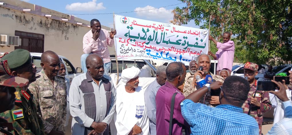*وسط رضاء تام من حكومة الولاية والقوات المسلحة والاجهزة الامنية تم اليوم تسليم الدفعة الأولى من نفرة عمال ولاية سنار عبارة عن ١٠٠٠ بطانية بقيمة خمسة عشر مليون جنيه وتم تسليمها دعماً للمجهود الحربي ومعركة الكرامة حيث أكد رئيس الاتحاد استاذ ابراهيم المدني ان هذه النفرة واحدة من دعائم ونفرة العاملين بالولاية وهذا من واجبات العمال تجاه القوات المسلحة من باب من جهز غازياً فقد غزا مؤكد وقفه عمال الولاية مع حرب الكرامة ضد المليشيا المتمردة متوعداً ان تكون هناك نفرات عديده واشاد قائد كتيبة اسود العرين سعاده العميد عمر بالوقفة المشرفة لعمال الولاية لوقفتها الكبيرة نصره لقوات الشعبالمسلحةورفع الدور الوطني شاكرا القيادة النقابية بالولاية وتحدث مدير جهاذ الامن والمخابرات سعادة اللواء العباس ان مثل هذه الأعمال ترفع من معنويات القوات المسلحة وكل الاجهزة الامنية الداعمه في حرب الكرامة مؤكدا رضاه التام من عمال ولاية سنار وتحدث مشرف نقابات عمال ولاية سنار الدكتور محجوب محمد وزير المالية بالولاية مؤكدا ان عمال ولاية سنار هم الجسم القوي والداعم في كل المحاور وبالاخص دعم عمالها لمعركة الكرامة واكد ان عمال ولاية سنار قد تحملوا كثير وبالاخص تأخر المرتبات لعلمهم التام بالظروف التي تحيط بالبلاد شاكرا لهم هذه الوقفة وهي في حد زاتها دعماً للمجهود الحربي ومعركة الكرامة وتحدث رئيس المقاومة والاستنفار بالولاية سعادة اللواء م النور ان مثل هذه الأعمال تعتبر هي السند الحقيقي المدني مباركاً خطوة اتحاد عمال ولاية سنار ونفرتها في دعم المجهود الحربي ومعركة الكرامة وأكد ممثل والي سنار السيد امين عام حكومة الولاية الاستاذ البرير مباركاً هذه النفرة التي نالت رضاء كل الاجهزة الحكومة والامنية مؤكدا ان والي سنار اللواء معاش الزبير حسن السيد راضي كل الرضاء عن اتحاد عمال ولاية سنار مؤكداً الوقفة القوية مع كل برامج الإتحاد بالولاية ومع عمال ولاية سنار*