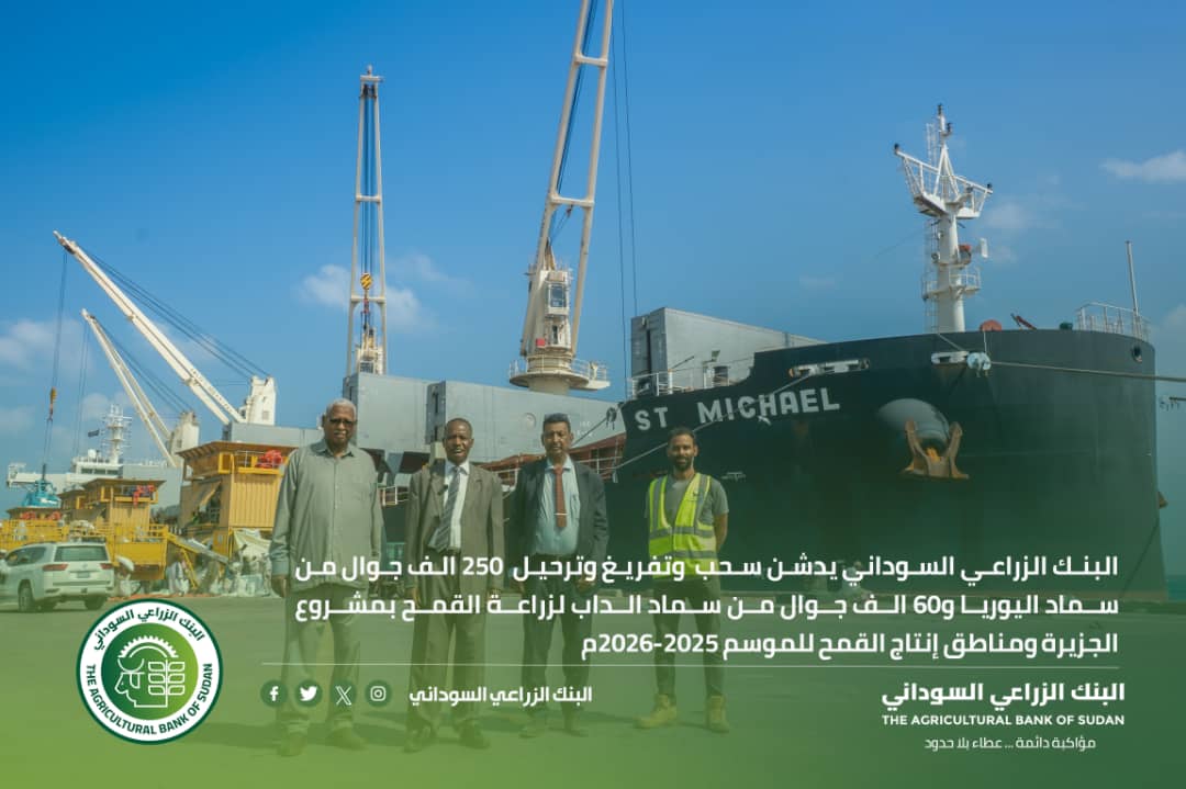 دشن المدير العام للبنك الزراعي السوداني المهندس عبدالله الحسن محمود يرافقه مساعد المدير العام التجاري والمخزون الاستراتيجي الاستاذ صديق عوض محمد دشنوا سحب وتفريغ وترحيل كميات إضافية من سماد اليوريا والداب إلى مشروع الجزيرة بتمويل من وزارة المالية والتخطيط الاقتصادي لصالح البنك الزراعي السوداني هذا وبشر المدير العام للبنك الزراعي جميع المزارعين في مناطق الإنتاج بمشروع الجزيرة بالشروع الفوري في ترحيل الكميات إلى الفروع بقطاع الجزيرة لإيصالها للمزارعين وثمن جهد محافظ مشروع الجزيرة المهندس إبراهيم مصطفى في التنسيق والمتابعة لتوفير هذه الكميات هذا وأكد المدير العام للبنك الزراعي السوداني التزامه بدعم المزارعين وتوفير المدخلات الزراعية لضمان نجاح العروة الشتوية وتحقيق الأمن الغذائي في البلاد