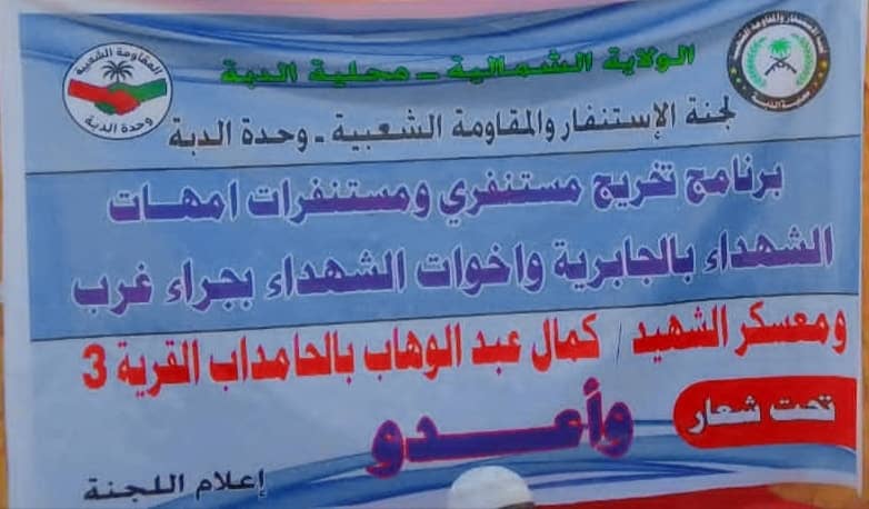 شهدت الجابرية وسط بمحلية الدبة بالولاية الشمالية ، مساء الجمعة الموافق 28 نوفمبر، احتفالًا رسميًا بتخريج دفعة جديدة من المستنفرات عقب اكتمال برنامجهن التدريبي، وذلك وسط حضور لافت لعدد من القيادات العسكرية والأمنية والشخصيات الوطنية والمجتمعية، على رأسهم العميد الركن عبد الناصر محمد علي طه قائد الاستنفار والمقاومة الشعبية بالمحلية، وممثل المقاومة الشعبية بمحلية آلدبة العمدة عطا المنان جابر، و مسؤول الاستنفار والمقاومة الشعبية بوحدة الدبة الإدارية السيد عبيد الله الدرملي، والسيد إبراهيم محمد الحسن والمرأة بالمقاومة الشعبية وعدد من الشخصيات الرسمية والشعبية والعسكرية الهامة في المنطقة.