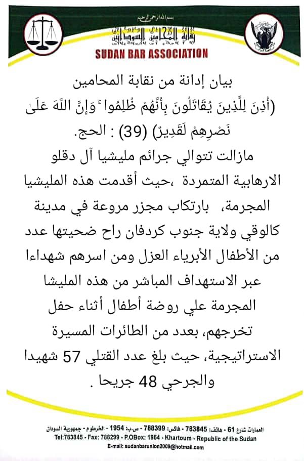 عليه تدين نقابة المحامين السودانيين باشد العبارات هذا المسلك الاجرامي البغيض المخالف للقانون الدولي الانساني ، وتهيب دول العالم اجمع وهيئاته ومنظماته القيام بمسئولياتهم تجاه استهداف المواطنين العزل من قبل هذه المليشيا المتمردة ، و ان تقوم كذلك علي وجه السرعة بادانة هذه الجرائم المتكررة بحق المدنيين السودانيين العزل، وتطالب نقابة المحامين السودانيين بايقاف هذه الجرائم البشعة علي وجه السرعة ،و تقديم قادة هذه المليشيا المتمردة المجرمة وأتباعها السياسيين، ومعاونيهم من الدول والمنظمات لمحاكمات عاجلة لارتكابهم جرائم الابادة الجماعية والاغتصاب والسرقة والنهب والتهجير القسري وغيرها من الجرائم الخطيرة .