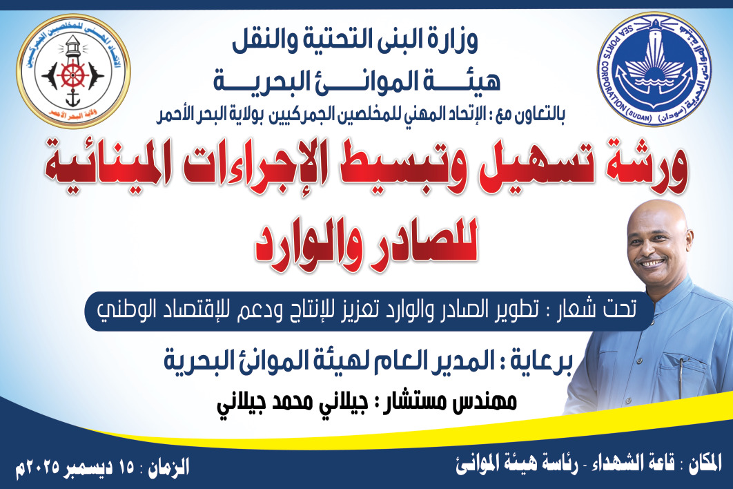 فرغت هيئه الموانئ البحريه والاتحاد المهني للمخلصين الجمركيين بالبحر الاحمر من اعداد ورشة تبسيط وتسهيل الاجراءات المينائية للصادر والوارد والتي تنطلق يوم الاثنين 15 ديسمبر الجاري تحت شعار (تطوير الصادر والوارد تعزيز للانتاج ودعم للاقتصاد الوطني تحت رعايه المدير العام لهيئة الموانئ البحريه مهندس مستشار جيلاني محمد جيلاني.