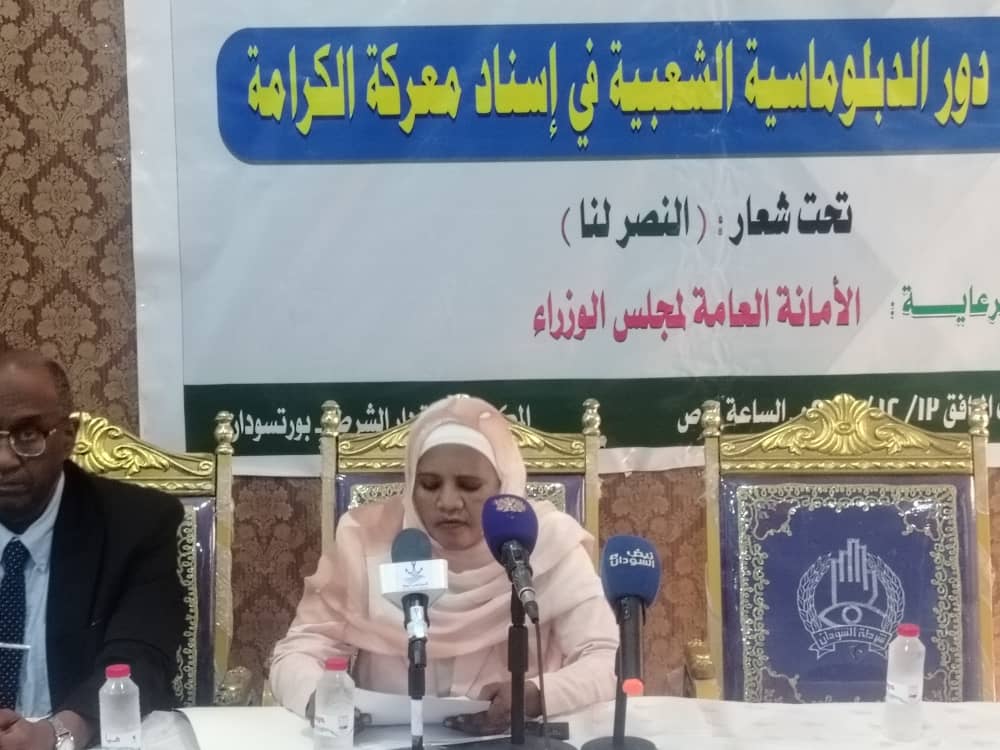 حيث اكدت د. سلوى محمد محجوب، الأمين العام لمجلس الصداقه الشعبيه عن دور الدبلوماسية الشعبية في إسناد معركة الكرامة التي نظمها المجلس بالتعاون مع مركز دراسات العلاقات السياسية الدولية برعاية الأمانة العامة لمجلس الوزراء وذلك بدار الشرطة ببورتسودان، أن الدبلوماسية الشعبية لم تكن بديلاً للدبلوماسية الرسمية، وإنما مساراً مكملاً وداعماً لها، يسهم في تعزيز الخطاب الوطني وإيصال رسالة السودان إلى الشعوب والمجتمعات الدولية بوسائل أكثر تأثيراً.
