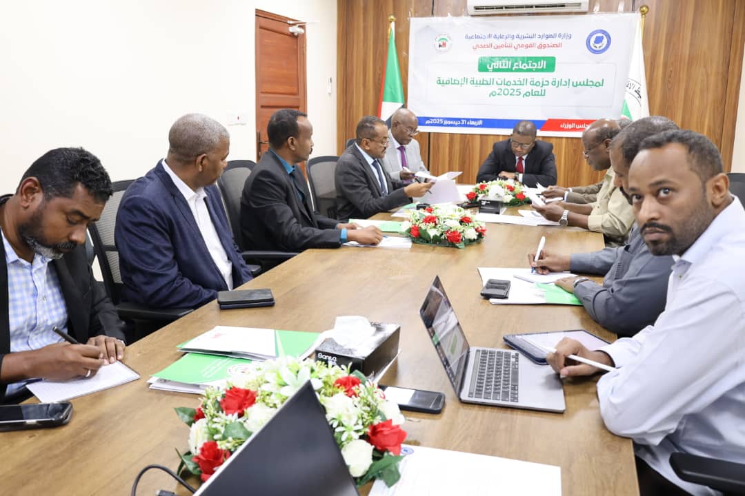أجاز الاجتماع الثاني لمجلس إدارة حزمة الخدمات الطبية الاضافية برئاسة الأمين العام لمجلس الوزراء- السفير على محمد علي رئيس مجلس إلادارة – خطة وموازنة حزمة الخدمات الطبية الاضافية للعام 2026م بحضور وكيل أول وزارة المالية عبدالله إبراهيم – ممثل وكيل وزارة الخارجية السفير أونور أحمد -وكيل وزارة الموارد البشرية والتنمية الاجتماعية د. أبوبكر ضحية – وكيل الحكم الاتحادي أباذر الحافظ ( إسفيريا )، وكيل وزارة الصحة د. علي بابكر( إسفيريا )، بجانب المدير العام للصندوق القومي للتأمين الصحي د. فاروق نور الدائم – مدير برنامج حزمة الخدمات الطبية الاضافية- د. الفارابي إبراهيم- وعدد من الأعضاء.