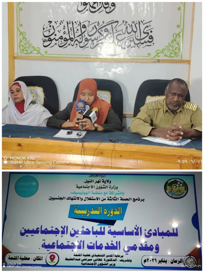 شهدت اليوم محلية المتمة تدشين الدورة التدريبية من برنامج الحملة الثالثة من الإستغلال والإنتهاك الجنسيين الممول من منظمة اليونيسيف بتشريف وزير الشؤون الاجتماعية الدكتورة تهاني ميرغني وزير الشؤون الاجتماعية وحضور المدير التنفيذى لمحلية المتمة الأستاذ شمس الدين محجوب والاستاذه رحمة حسن بشير مدير الاداره العامة للرعاية الإجتماعية بالولاية والاستاذه مهالك الزبير المدير التنفيذى لمكتب الوزير والاستاذه أميرة الخير مدير الشؤون المالية وأيضا حضور الاستاذه هويدا دكين مدير الاداره العامه للرعاية الاجتماعية بمحلية المتمة وحضور الجهات الأمنية والشرطية بالمحلية وعدد من قيادات المحلية