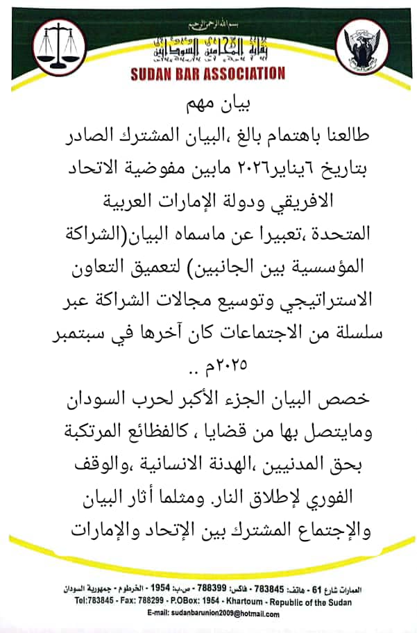 طالعنا باهتمام بالغ ،البيان المشترك الصادر بتاريخ ٦يناير٢٠٢٦ مابين مفوضية الاتحاد الافريقي ودولة الإمارات العربية المتحدة ،تعبيرا عن ماسماه البيان(الشراكة المؤسسية بين الجانبين) لتعميق التعاون الاستراتيجي وتوسيع مجالات الشراكة عبر سلسلة من الاجتماعات كان آخرها في سبتمبر ٢٠٢٥م ..