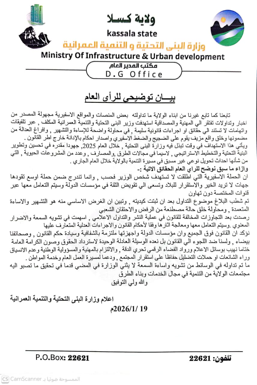 وزراة البنى التحتية بكسلا تصدر بيان وتوضح.. التفاصيل بالداخل