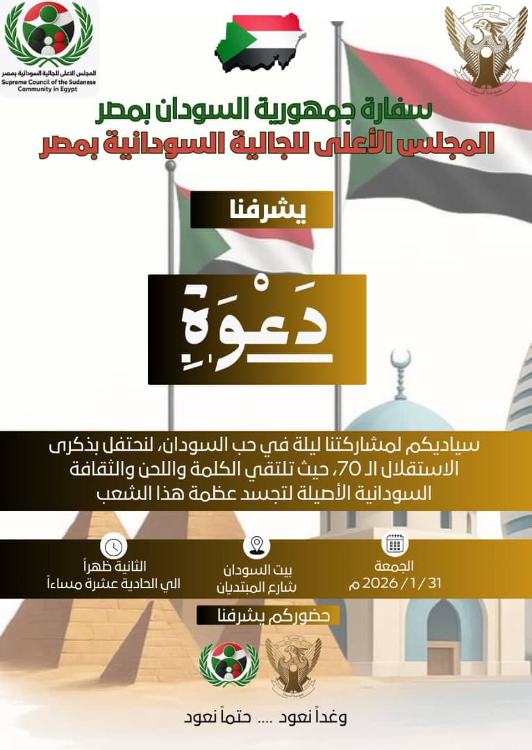 تحتفل الجالية السودانية بجمهورية مصر العربية في الثلاثين من يناير الجاري بمناسبة الذكرى السبعين لاستقلال السودان، بهدف تعزيز العلاقات الأزلية بين شعبي وادي النيل. تشمل الفعاليات برنامجاً متنوعاً من الأنشطة الرياضية والثقافية والفنية.