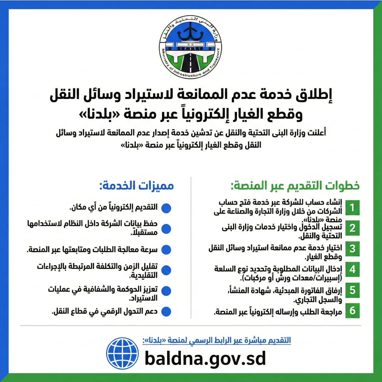 هي خدمة رقمية جديدة تُمكِّن الشركات من التقديم للحصول على عدم الممانعة لاستيراد وسائل النقل وقطع الغيار إلكترونياً بالكامل، دون الحاجة للحضور إلى مقر الوزارة.