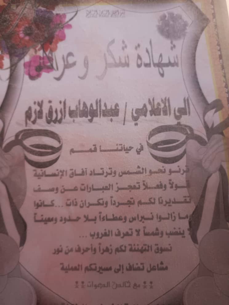 و على صعيد زي صلة قدمت منصة نازحي الخرطوم والولايات شهادة تقديرية إلى الإعلامي عبد الوهاب أزرق ضمن ختام الدورة التدريبية بعنوان المعلم المنقذ التي نفذتها المنصة بتمويل أيضا من NRC .