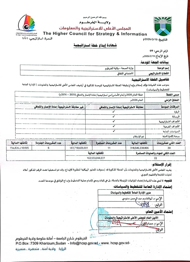 وجاء إيداع الخطة للمجلس الأعلى للتخطيط الاستراتيجي بالولاية برعاية وإشراف الدكتور فتح الرحمن محمد الأمين مدير عام وزارة الصحة الوزير المكلف، وبمشاركة أعضاء مجلس الوزير للتخطيط، الذين أكدوا أن المرحلة المقبلة ستشهد تركيزًا على استعادة الخدمات الصحية الأساسية، وتأهيل المؤسسات، وتعزيز كفاءة الموارد البشرية، وتطوير نظم المعلومات الصحية، بما يواكب متطلبات المرحلة.