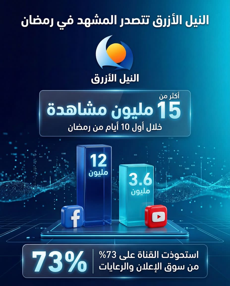 بهذا الأداء تواصل قناة النيل الأزرق ترسيخ موقعها في صدارة المشهد الإعلامي مؤكدة أن الريادة تُقاس بنسب المشاهدة و بحجم الثقة والاستثمار الذي تضعه كبرى العلامات التجارية في شاشتها المتفردة دوما