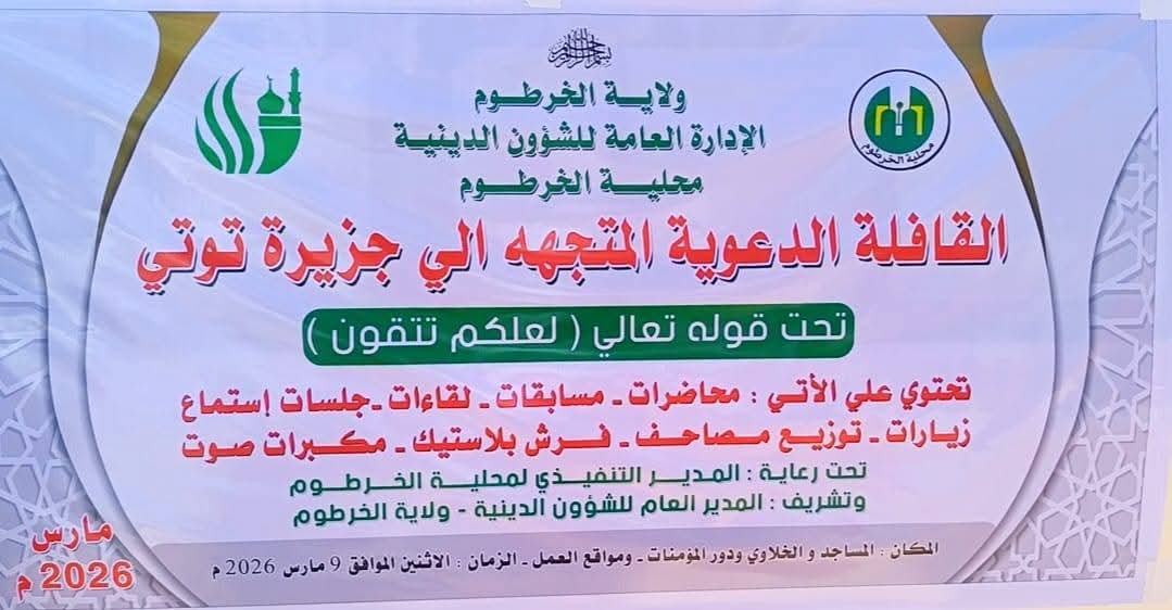 مشيرا بأن القافلة المتجهة لتوتي تستهدف (١١) مسجدا ودور مؤمنات ضمن برنامج العشر الأواخر من رمضان المعظم إضافة إلى زيارات لأسر الدعاة وتوزيع مصاحف لكل مساجد المحلية في إطار إعادة إعمار المساجد والدور الدعوى الذي اضطلع به في تذكية المجتمع.